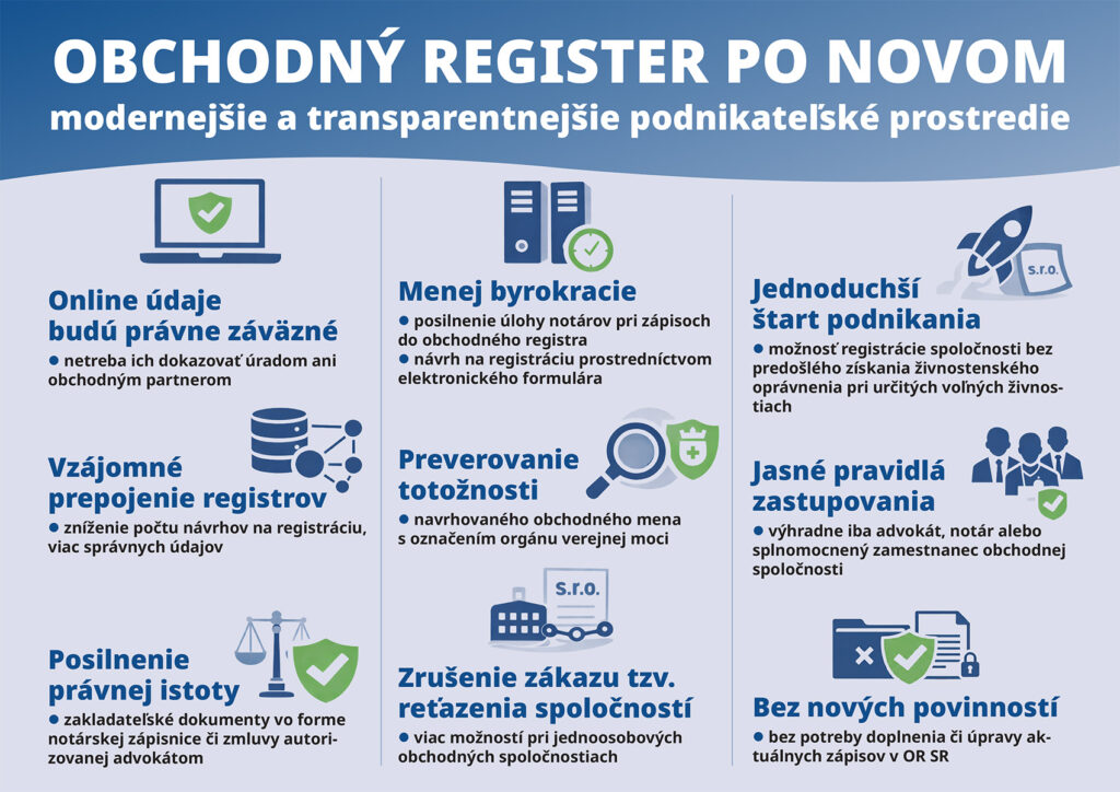 Vládny návrh zákona o obchodnom registri, ktorý tento týždeň schválila Národná rada SR, prináša viacero zásadných noviniek, ktoré výrazne ovplyvnia registrovú prax v podmienkach Slovenskej republiky.